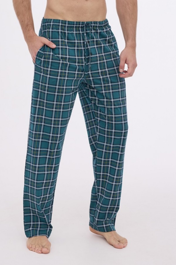 Pantalon de pijama pentru barbati realizat din bumbac de inalta calitate. Pantalonul este lung, are talie elastica confortabila, prezinta model deosebit cu carouri, este prevazut cu buzunare laterale, are slit ce se fixeaza cu ajutorul a doi nasturi si se ajusteaza in talie cu ajutorul unui snur.
